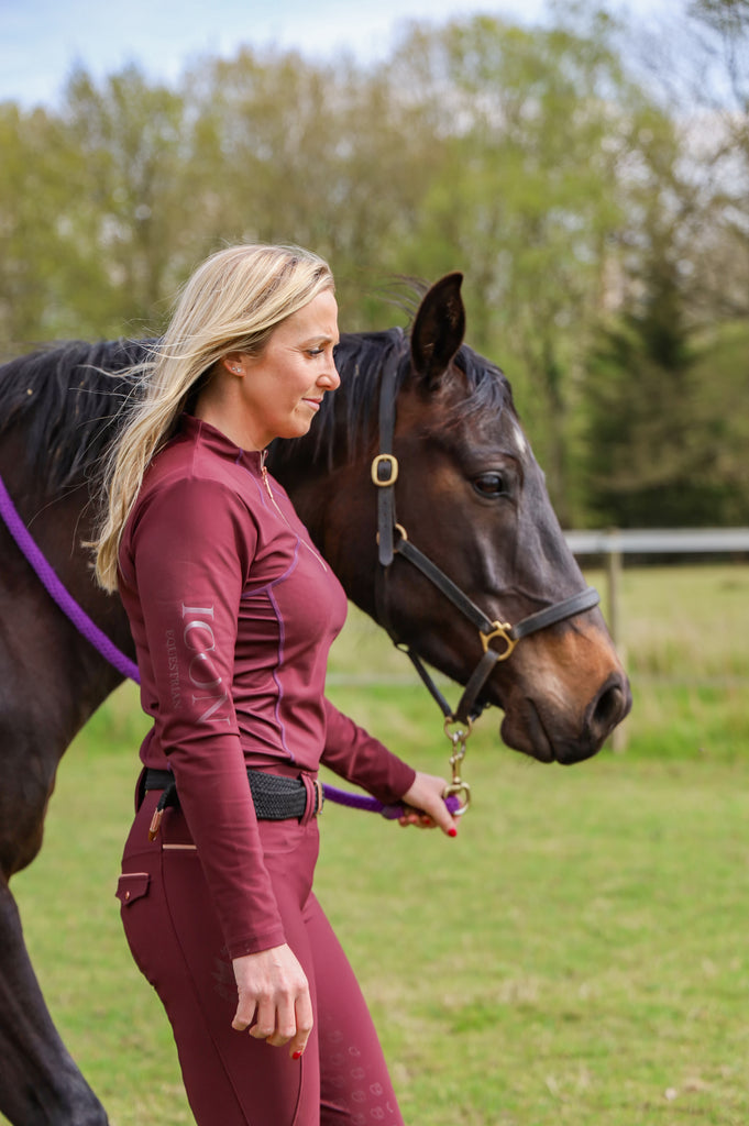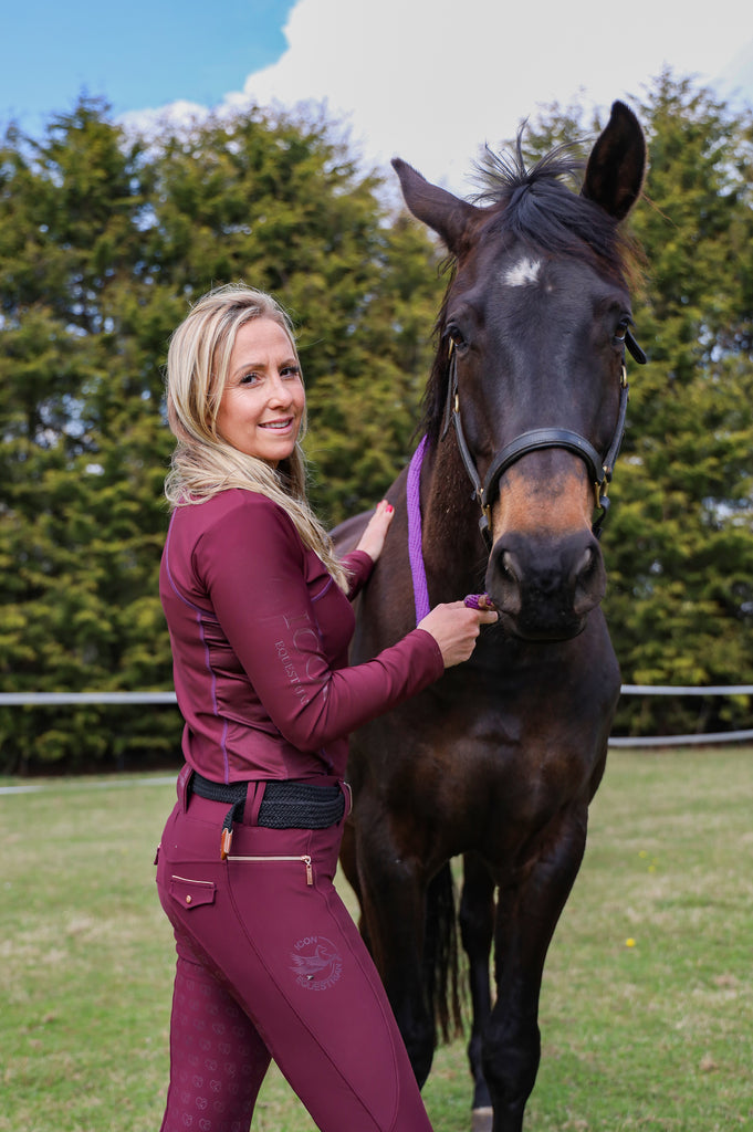 The elegant burgundy shade pairs seamlessly with our leggings, creating a coordinated look that’s both functional and fashionable. Whether you're training, competing, or enjoying a casual ride, this base layer ensures you stay comfortable, stylish, and ready for anything.